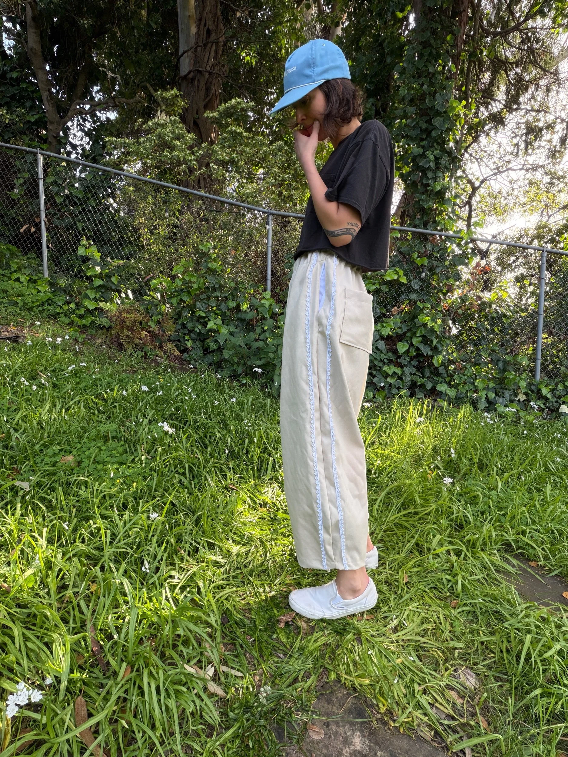Available in sizes extra small-3XL. These pants have deep side pockets, two back pockets, and optional beige trim down the sides. I will email to coordinate with you about details before fabrication starts. This order will take 4-6 weeks to complete.