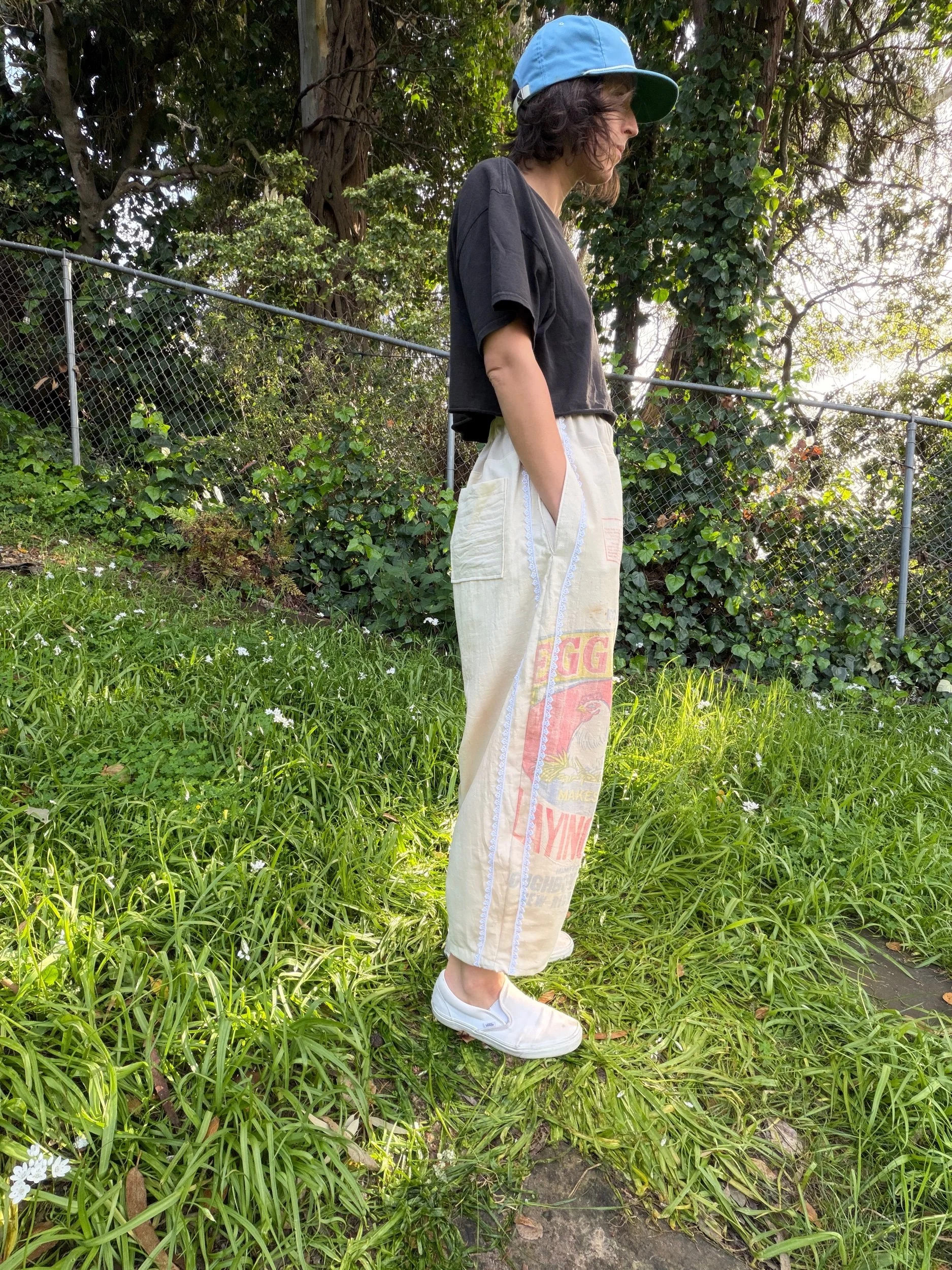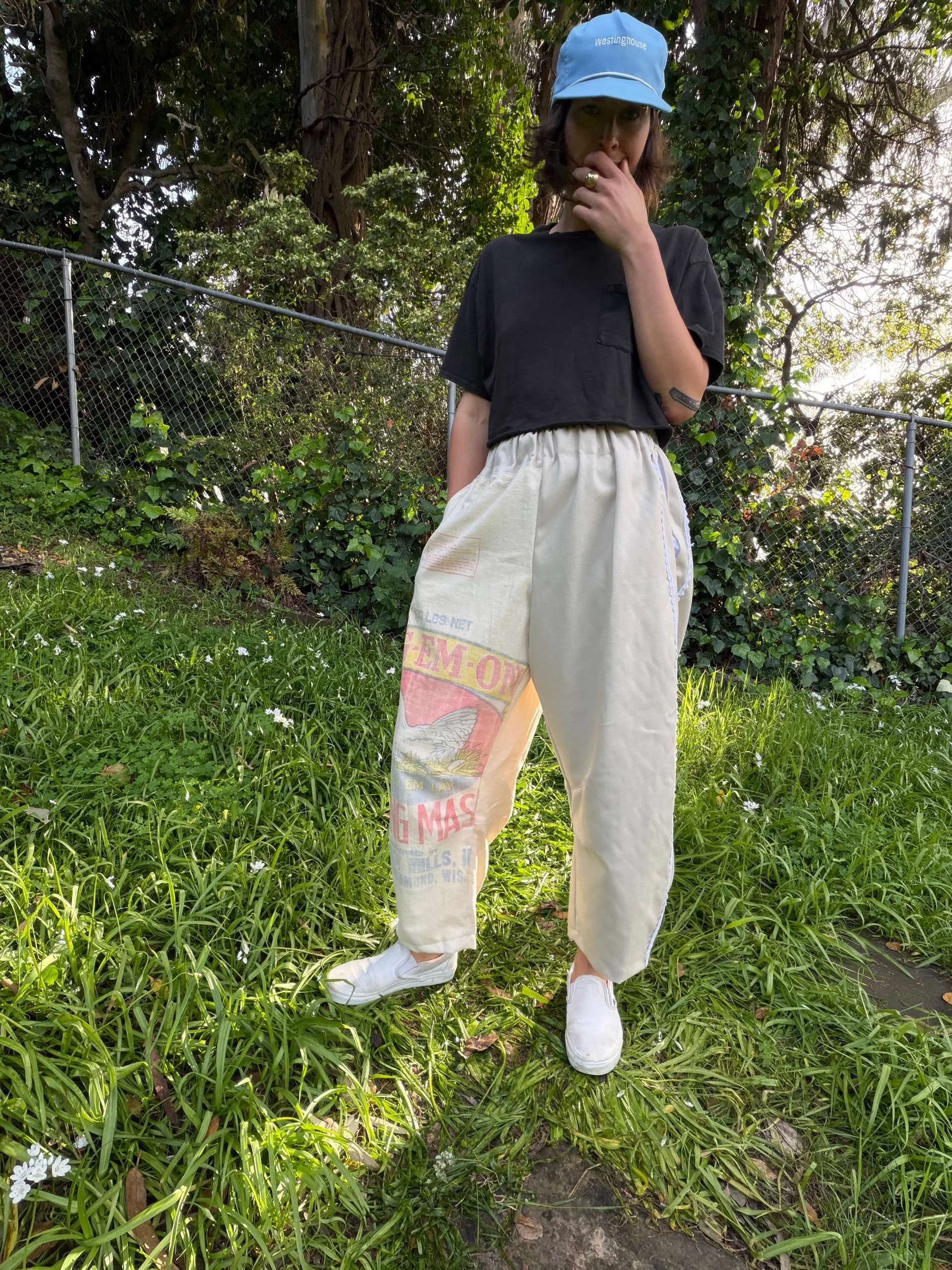 This is a pair of barrel leg pants made-to-order in your size! Pants in the photos show an example of what your pants will look like, but they’ll be made with the oat sack featured in the last photo.