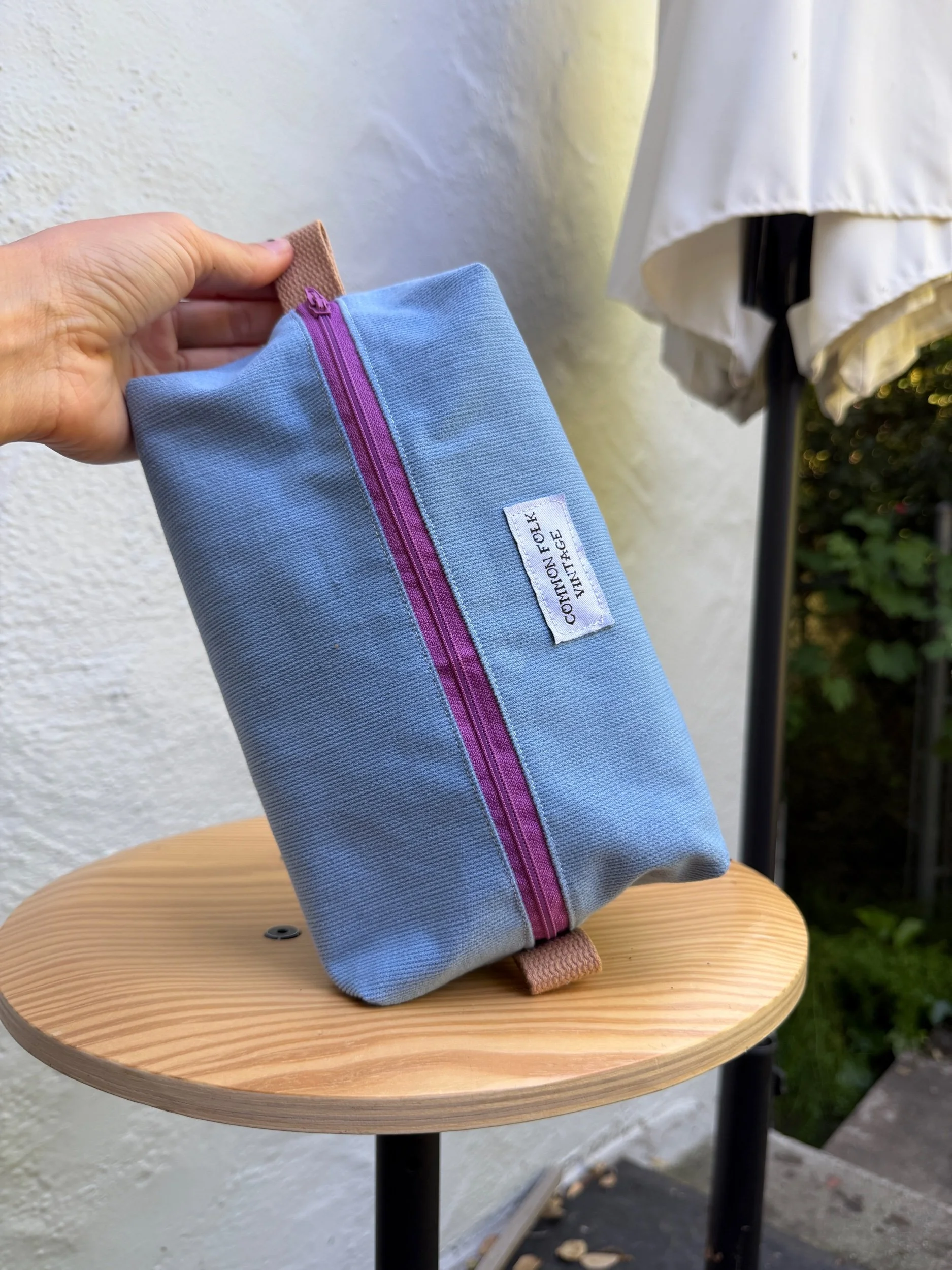 Handmade ditty bag crafted from a secondhand textile. This is a lined Dopp kit.