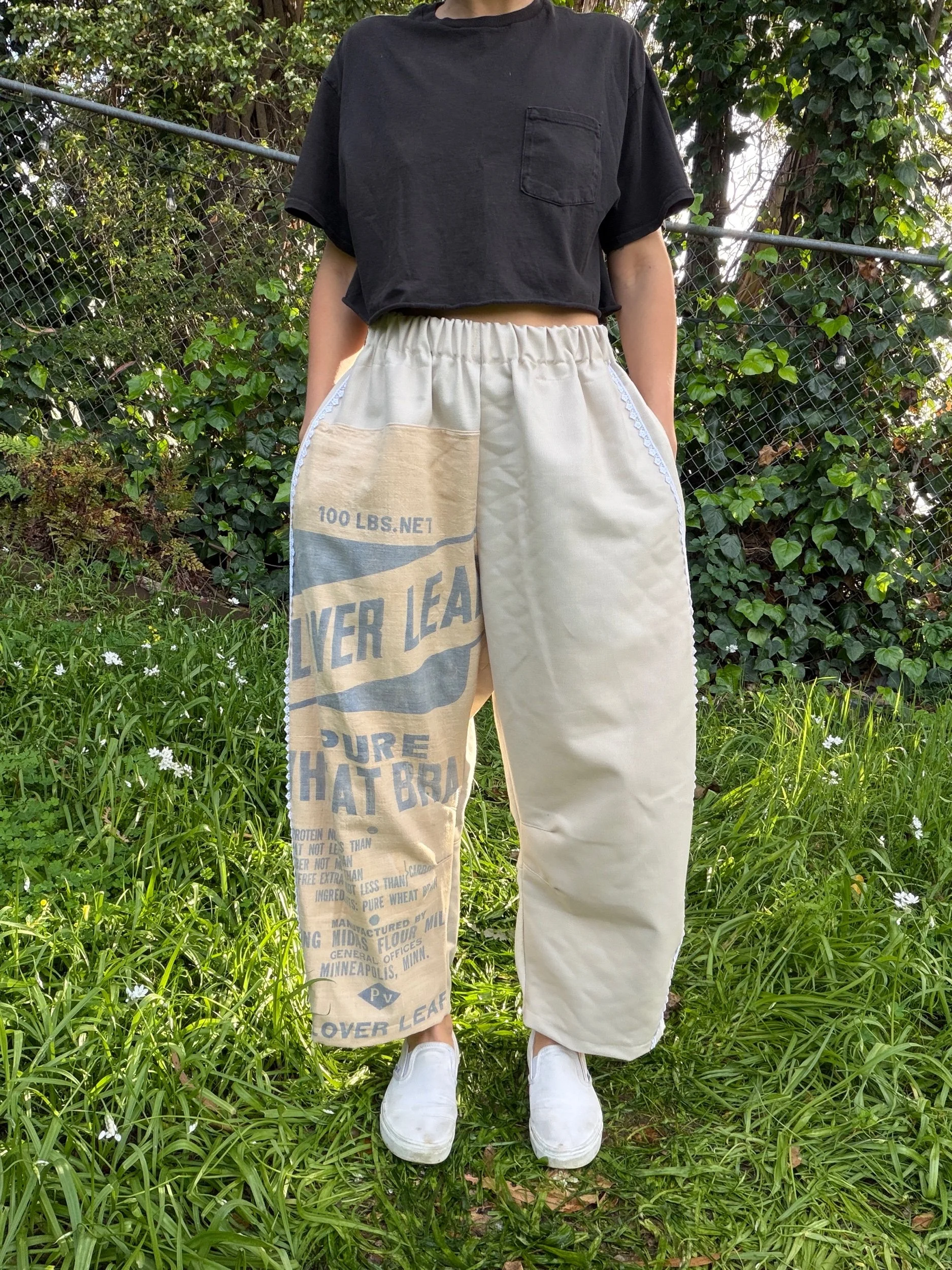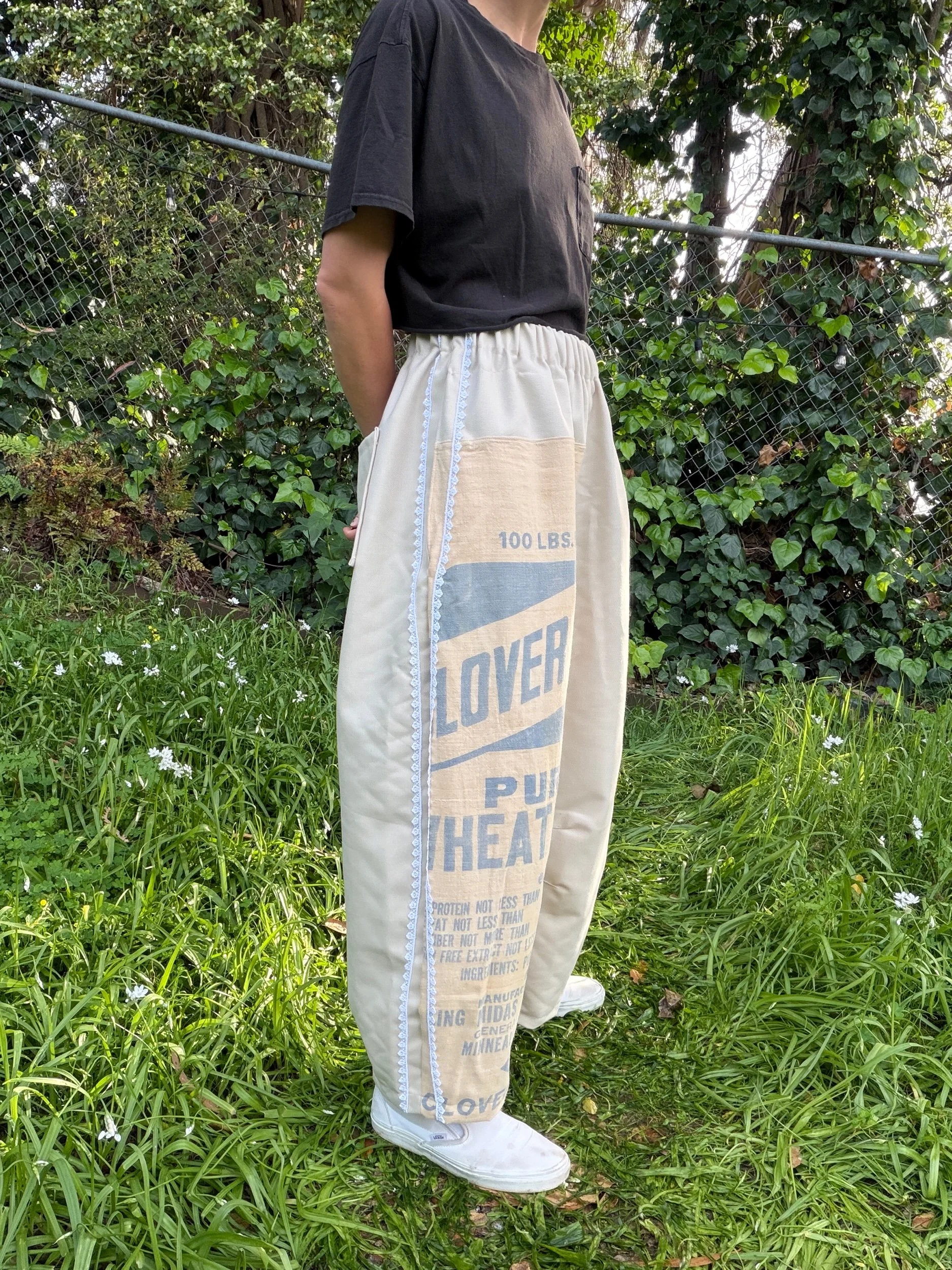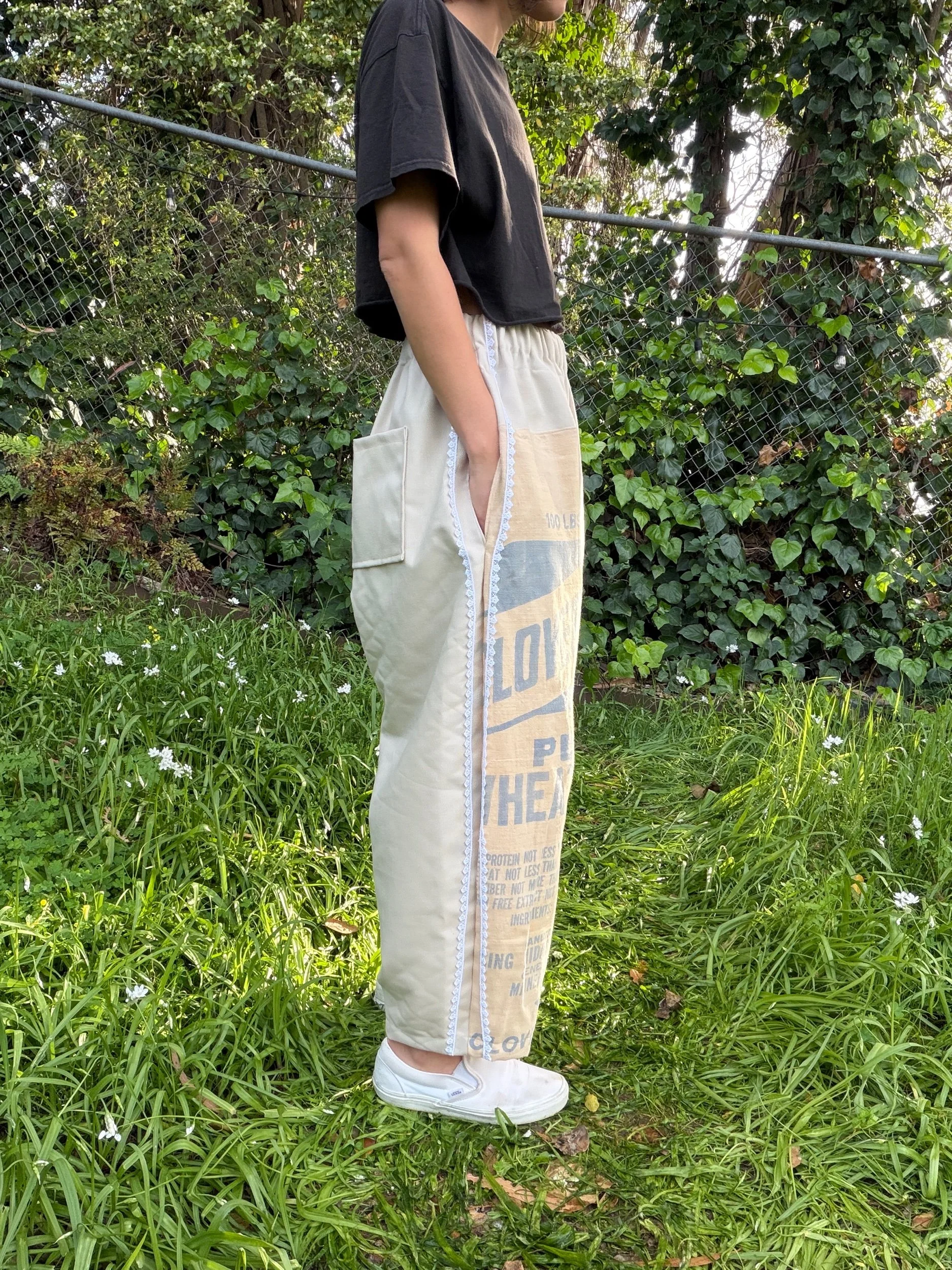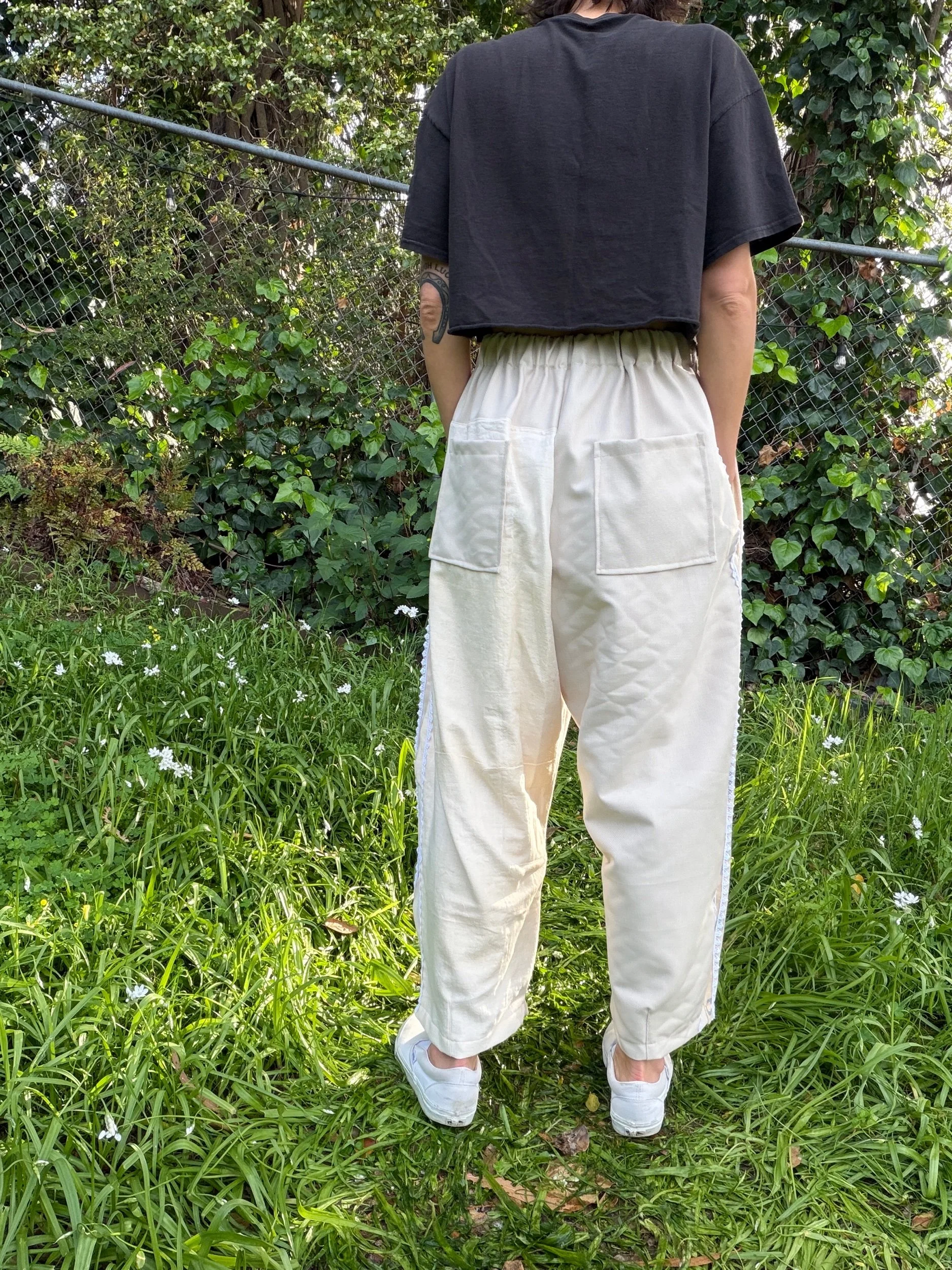This is a pair of barrel leg pants featuring a curved shape and tapered ankle. These pants have deep side pockets, two back pockets, and beige trim down the sides.